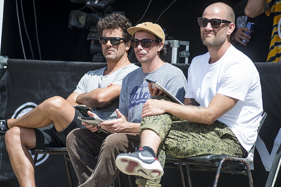 Your judges for Saturday. These guys definitely have the hardest job here: Volcom's Roberto Aleman from Spain, James Craig from the US and Thomas Kring from Denmark.