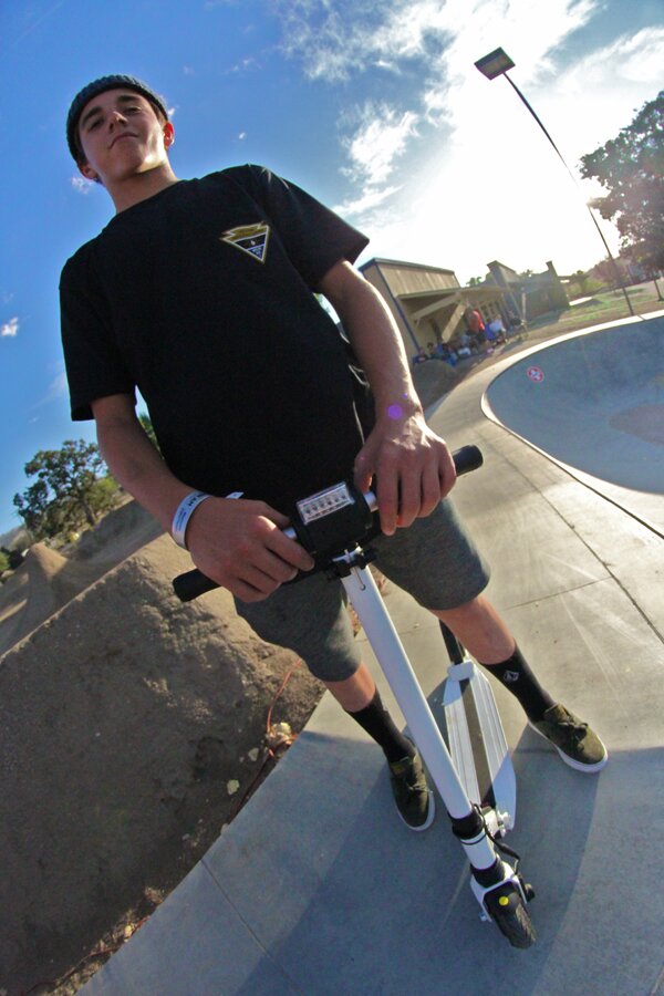 Alex Midler can't skate due to injury so he cruised in on his electric Razor scooter to cheer on the homies.