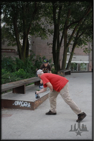 Onward to Amsterdam Gravette's snoring is louder than this kickflip back smith on a metal bench