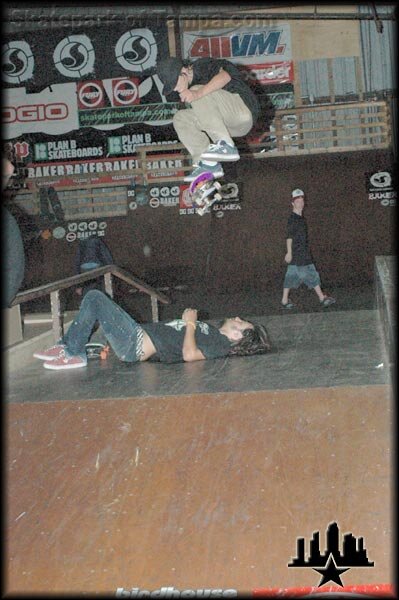 Emmanuel Guzman gives the kids what they want at demos - stunts! This is a kickflip over Adrian. Adrian should have lit himself on fire for added entertainment