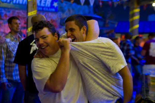 Colin Clark's v-neck granite shirt was a target for destruction even when we were sober. Eric gets it started by deepening the neck.