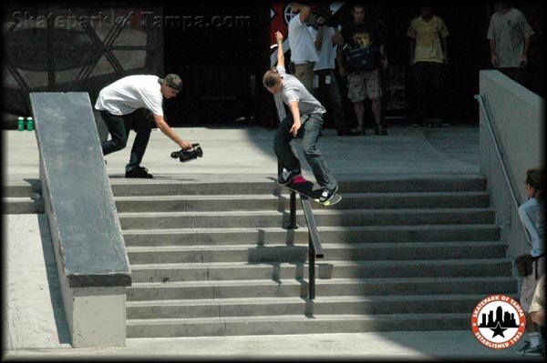 Who dat? I don't know, but this chick rides for Element and she rips. First try feeble grind down the nine stair rail
