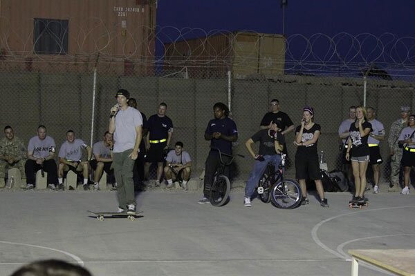 Talking on the microphone, just thanking all of our soldiers for what they do.