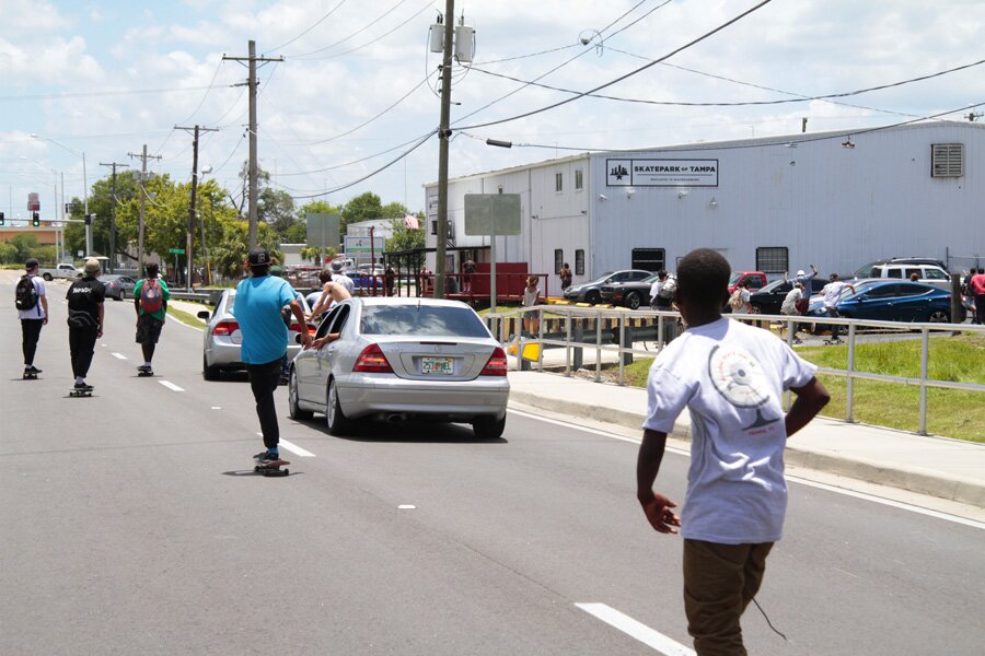 We finally made it! no more pushing. The park was about to get hit with a storm. About 100 kids ready to check in and skate for free courtesy of DC.