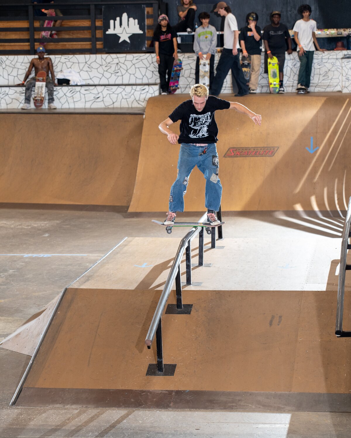 Caleb kicking things off with a well balanced boardslide across and down the kinked rail.