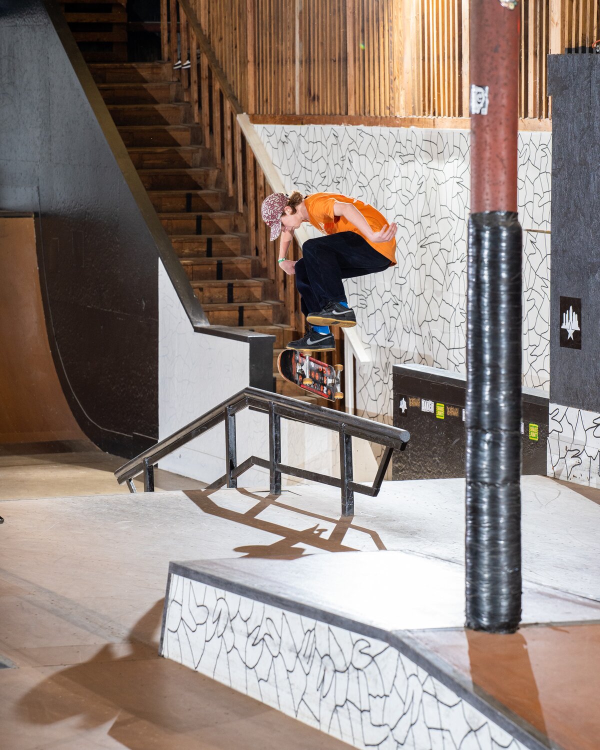 Atom Blanford repping Boards for Bros and Anchor Skate Supply Kickflip front board on the bump to rail