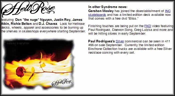 There's a new company called Hell Rose featuring: Don "the nuge" Nguyen, Justin Roy, James Atkin, Richie Belton and D.J. Chavez. Look for Hellrose decks, wheels, apparel and accessories to be burning up the shelves in skateshops everywhere starting September.
