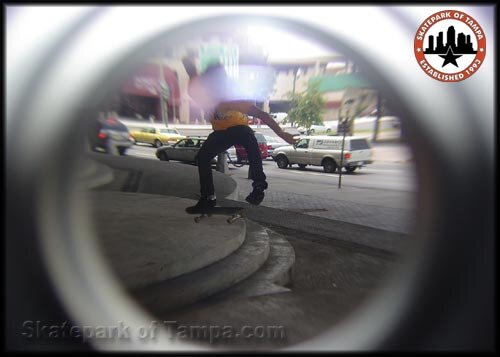 Ian Gow kickflips from pancake to pancake somewhere in New Orleans, LA - this is how the photo turns out when you take the fisheye off and turn it around