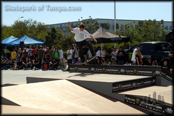 First up was the Tech Center. It was a little bit of chaos on this recycled Manny Mania obstacle. That's Jacob Evans ollieing up to 5-0 transfer down the bank