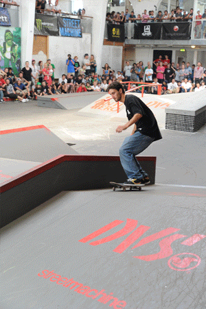 Javier Sarmiento was trying switch 360 flip to lipslide but the flip part didn't work out. He still rode away.