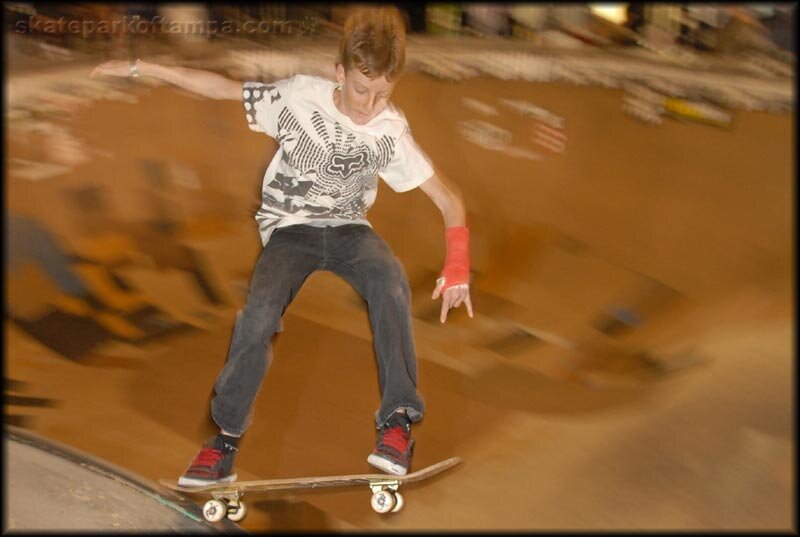 Skateboarding is dangerous. You can see by all the casts in the upcoming photos. Jordan Price is throwing out the horns on his cast. He should throw out that Fox shirt, too. Oh wait, he can't, he's sponsored by them. It's okay, he's from backwoods Florida and probably has six MotoX bikes and a four wheeler to go with it. Jordan is one of my favorite little kids these days so I can give him all kinds of crap like that