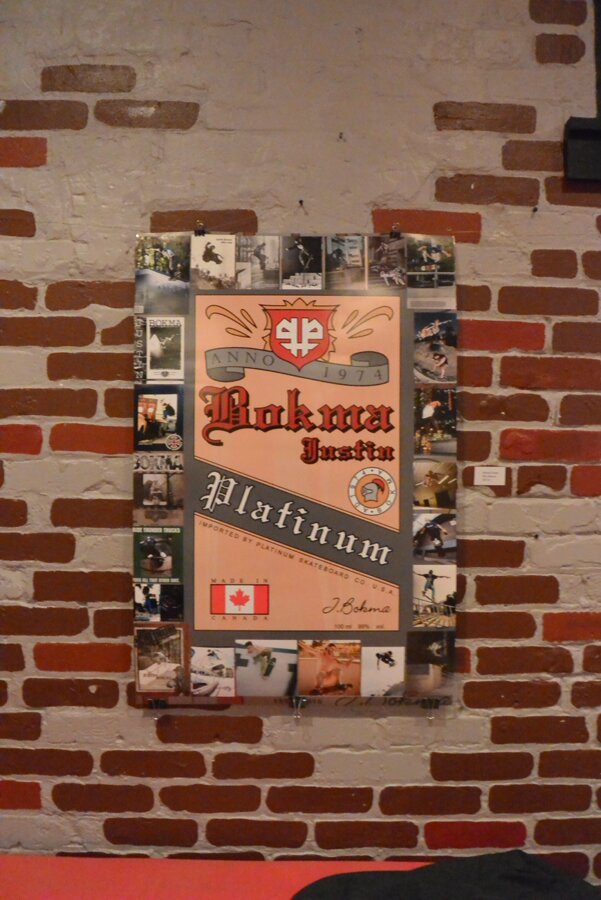 Poster of Justin's pro graphics when he rode for Platinum Skateboards. Collage of pics around it. Made by Dan Bokma. SOLD OUT but you can buy an 8" x 10" reproduction of it here.