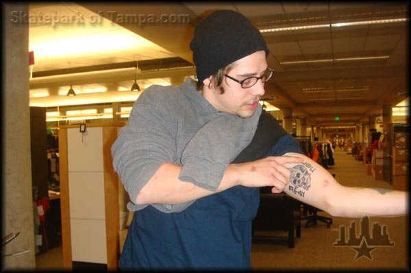 We ran into Justin Brock wandering the halls of the Nike campus. He's got some new ink. You may recognize it from all the tags we had to clean up around the Skatepark after the Am Contest. Frosty wants to fold Justin in half after that clean up job