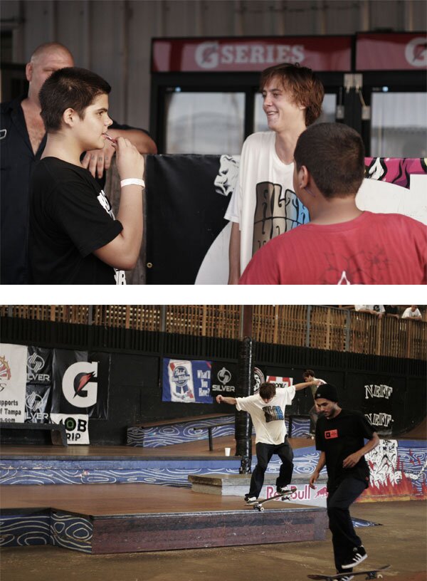 Top: Kenny Hoyle cruises a smooth and balanced back nosegrind while Josh from the snack bar creeps by.