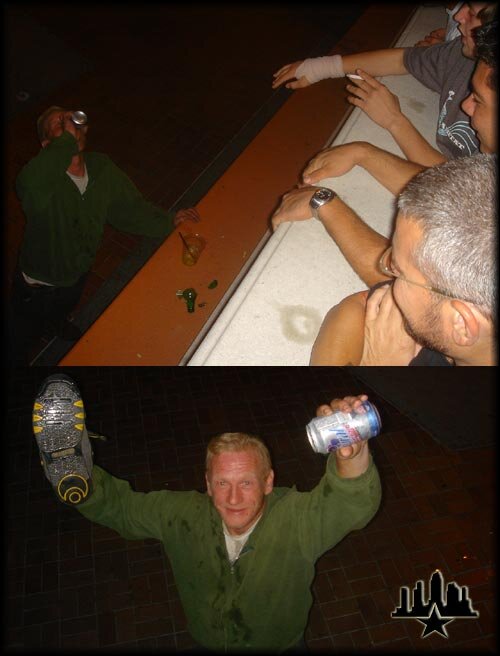 Even the bums in Cali are all cool guy, or at least trying to be. We were giving our new homeless friend here some drinks from the bar and our pillow case impromptu cooler and he was smashing the bottles in the street. Good times. Then we look down and he's rocking the D3's. I always wondered what happened to Dave Mayhew