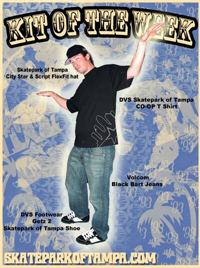 Our subject, Sean Albright, is wearing a magnificent Skatepark of Tampa City Star & Script FlexFit Hat to complement the rest of the black in his ensemble. Black is the new black this season so Sean is looking thuper thylish in his DVS Skatepark of Tampa CO-OP T Shirt and Getz 2 Skatepark of Tampa Shoes. Wrapping up this kit is a fantastic pair of Volcom Black Bart Jeans. Thweet!