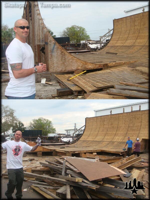 When Mike Frazier heard about the vert funeral we were having, he came out here to lay down in front of the bulldozers in protest. Nah, he's actually helping to tear down the Game of SKATE course with Frosty and Giles. There will be a new one, but it's not going to be pretty. More on that later