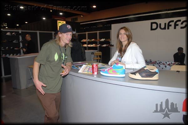 Nate Sherwood is on TV a lot lately it seems. This is the Duffs booth. A common sketchy skateboard industry marketing technique is to hire a decent looking female to man the front desk at your booth to attract attention. I think it works