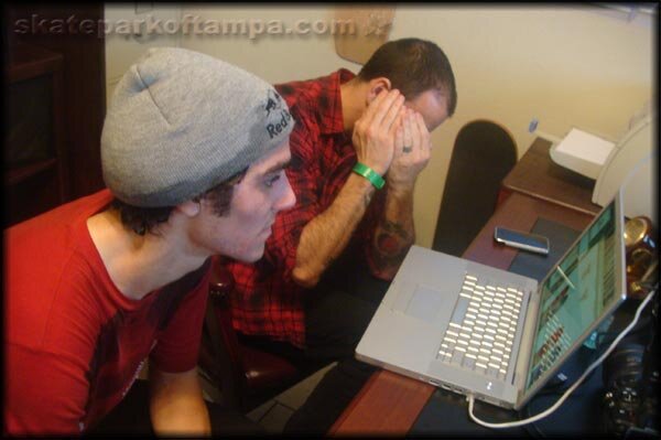 Jim Thiebaud doesn't like photos. Right now he's showing Nick Dompierre some drafts of his new pro model boards. Sometimes actual work gets done here at Tampa Pro