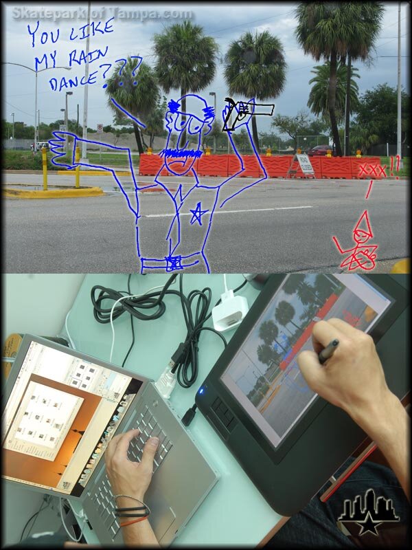 You know about these Wacom tablets that graphic designers use? I am far from a graphic designer as you can see, but I did get one as a toy. I was going to start drawing all my silly captions and stick figures on chill cam dumps, but it's too time consuming so I hardly ever get to use it. Anyway, the top photo is the parking lot entrance to the Bro Bowl. The city took the time to put up barricades to the entrance the night before to keep the public from using this public park. Wow, I'm pretty ashamed and embarassed of where I live right now. None of it mattered anyway because it rained all damn day