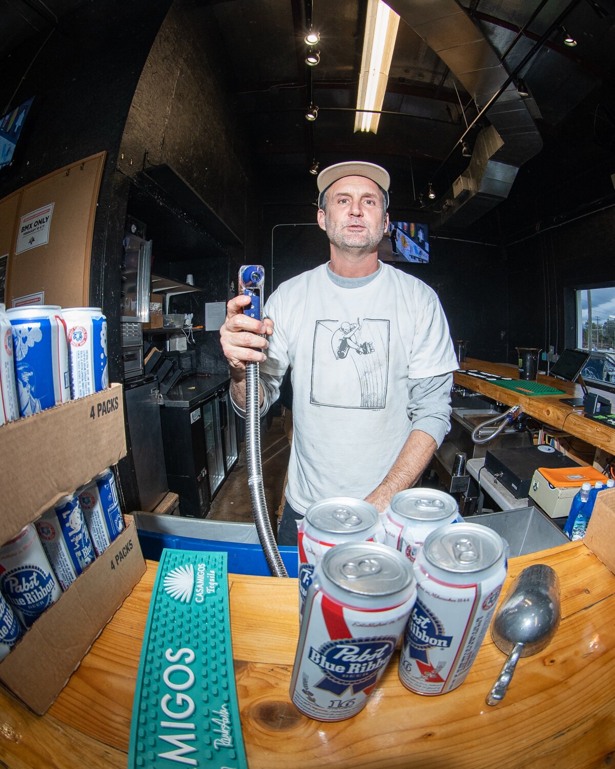 Had to go grab a drink from the venue, but this dude was back behind the bar playin games.