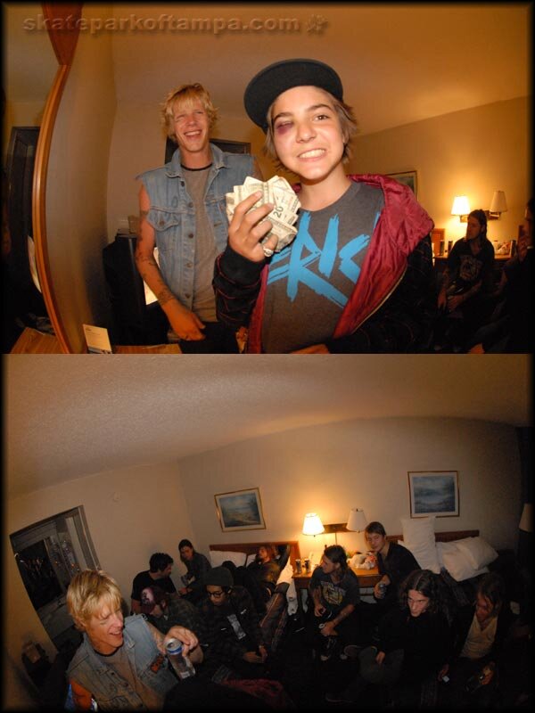 This little runt is Peter Hackett. He’s 14. He rips. He also smokes and drinks. Due to his drinking, he’s blowing the opportunity of a lifetime. Andrew Reynolds saw his tape and had him go on the tour last year, but because of his behavior, he wasn’t welcome back this year. We ended picking him up anyway because we drove through his town. He’s right back to being the crazy kid almost getting the entire crew kicked out of the campground every night at 5am. Pretty sad to see some talent like that be wasted. He’s another one in the crew that woke up with a black eye, courtesy of Bryan Herman. I rolled $100 games of dice with him and he cleaned me out. Check how packed this hotel room was