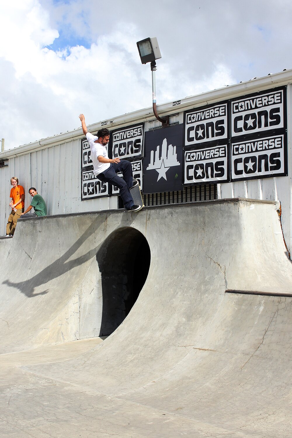 Ronnie Sandoval basically destroyed the Concrete Course all by himself. He even helped dry the puddles after it rained. A true Professional. Nose grind over the Hole.