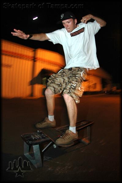 This is former employee John Paul and that's his DVS bench. He's multitasking on this boardslide collar popper