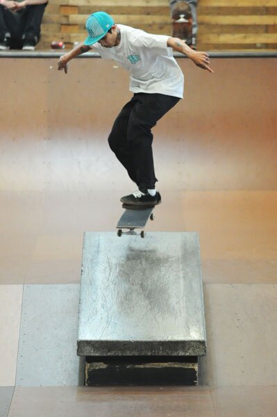 Robby Kirkland had king sized homie hype in the crowd, too. He had balancing acts like this kickflip manual leading right into a hardflip back lip on the small rail. That's how you qualify 1st. Bring that to Tampa Am, Robby.