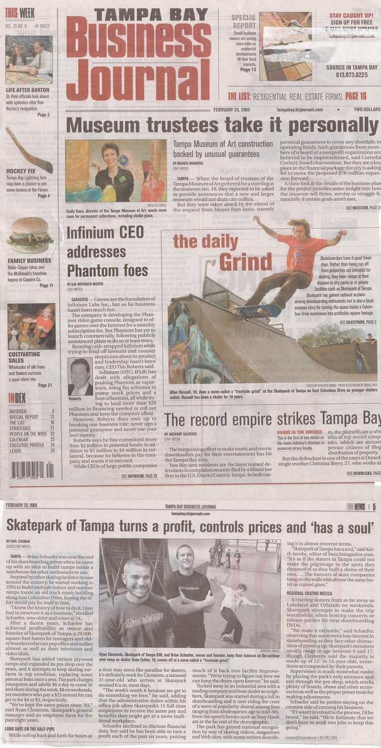 All those years as man-am paid off. Allen Russel gets his first magazine cover! This is an article that this local paper called the Tampa Bay Business Journal did about us because we're so, ya know, corporate and all. Is "excitable" a real word or did a new Schaeferism make it into print? I like how they called Ryan the "GM." In personal ads, that means "gay male." You go, girl. The story starts out kind of depressing with, "Brian Schaefer was near the end of his skateboard prime..."