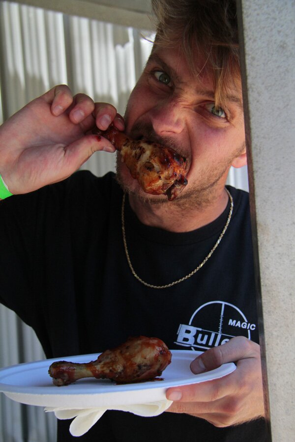 Cameron Hunt enjoying chicken wings cooked to perfection by Jona at Hazard.