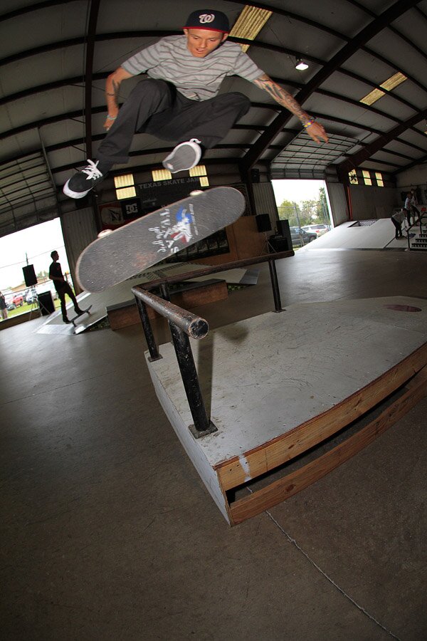 Jack Olson blew minds by kickflipping into every trick in best trick. Kickflip Nose grind.