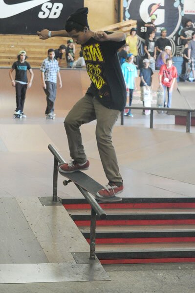 Starting out with a Who Dat? Sorry I didn't get your name. In addition to this smith grind, Mr. Dat had a nice 360 flip down the stairs here, too.