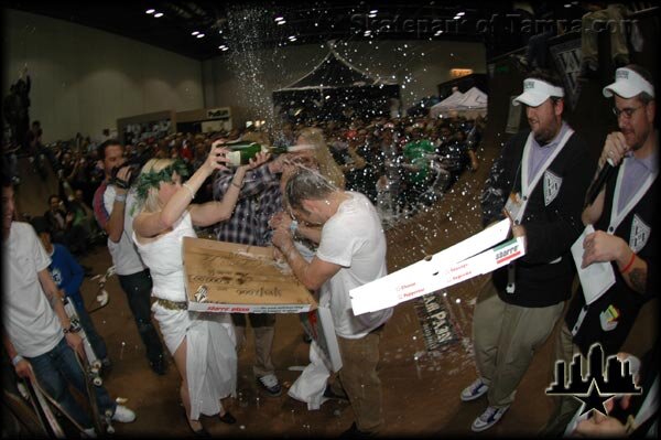 Surf Expo and Volcom's Toga Toga Toga Ramp Rush 2006 Kyle Berard gets a champagne shower from the toga girls after being announced winner of the Pro