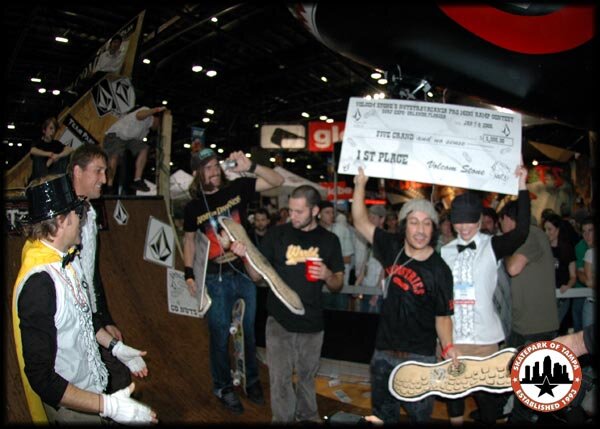 Surf Expo January 2005 Saturday Carlos De Andrade with his big check. Looks like Kyle Berard is looking at that deck like, "Can I ride this thing?"