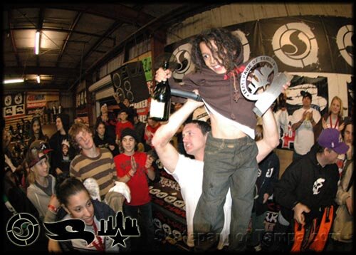 Brian Schaefer holds up Nyjah Huston. That bottle of champagne he's holding is probably older than he is
