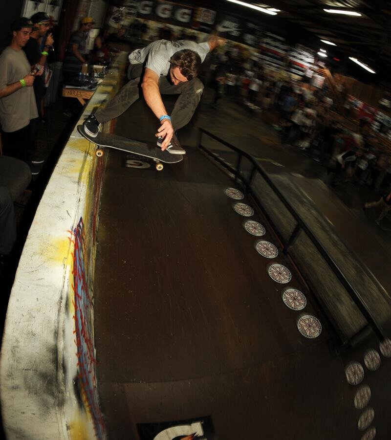 Ryan Thompson decided to noseslide the judge's stand. This wall is gigantic - it's neck high, but Ryan still managed to get on top of it and slide the shit out of this nose slide. Too bad he did it just after the Independent Best Trick official time ended.