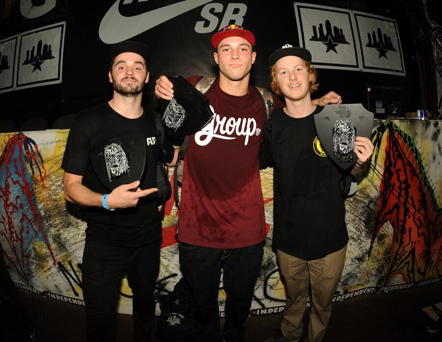 Independent Best Trick top 3 from left to right: Matt Berger - 1st with a frontside bluntslide across, big flip out; Sewa Kroetkov - 2nd with a 360 flip nose manual nollie front foot flip out; Jack Olson - 3rd with a switch 180 crooked grind nollie kickflip out