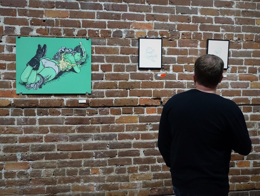 Here's a print from his Creature Babe series and some early sketches for this year's Tampa Am graphics.