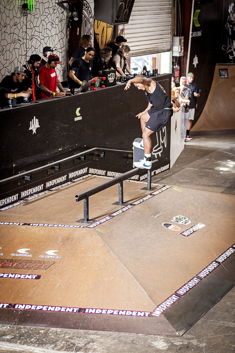 Power, control, and a school gym uniform.. Cordano Russell crushes a Fakie 5-O from bank to bank