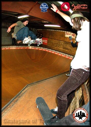 Tampa Pro 2005 Thursday Night Chris Haslam salutes Carlos De Andrade's huge frontside floater over the hip