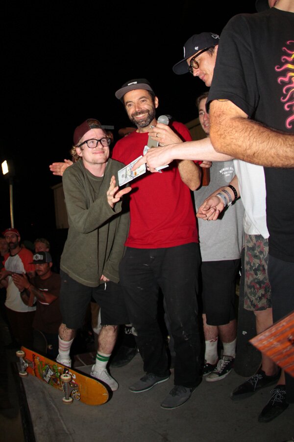 Paul Zitzer handing out cash for the top 5 tricks over the door gap, thanks to Converse.