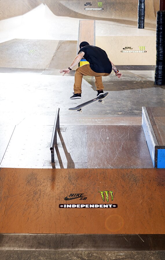 Chris Cole kicks off morning practice with a Backside Flip over the long box.