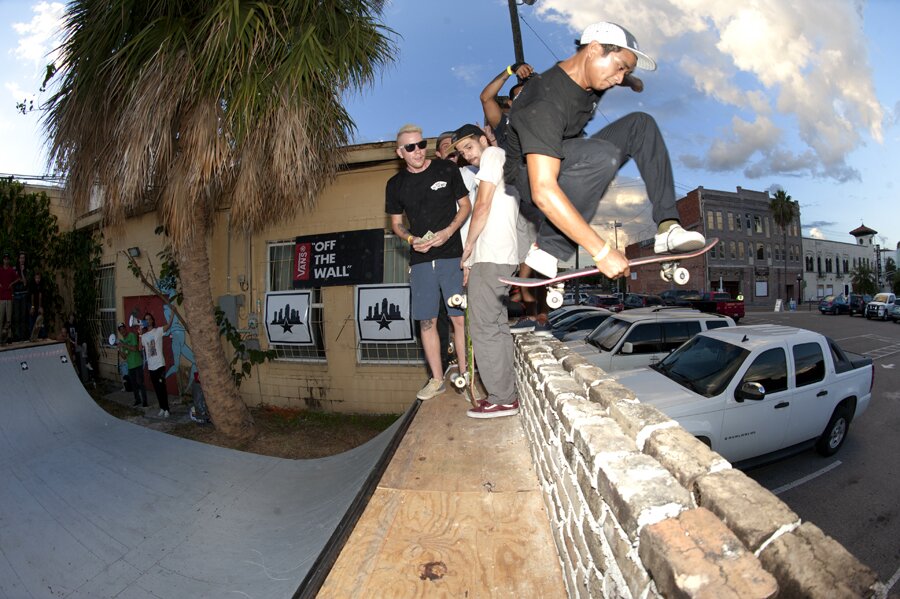 SPoT team rider and employee Uncle Sam Bellipanni launched out of the ramp, over the brick wall and into the parking lot about 8 feet below. It was epic, but he had something else up his sleeve. Read on and find out what it was.