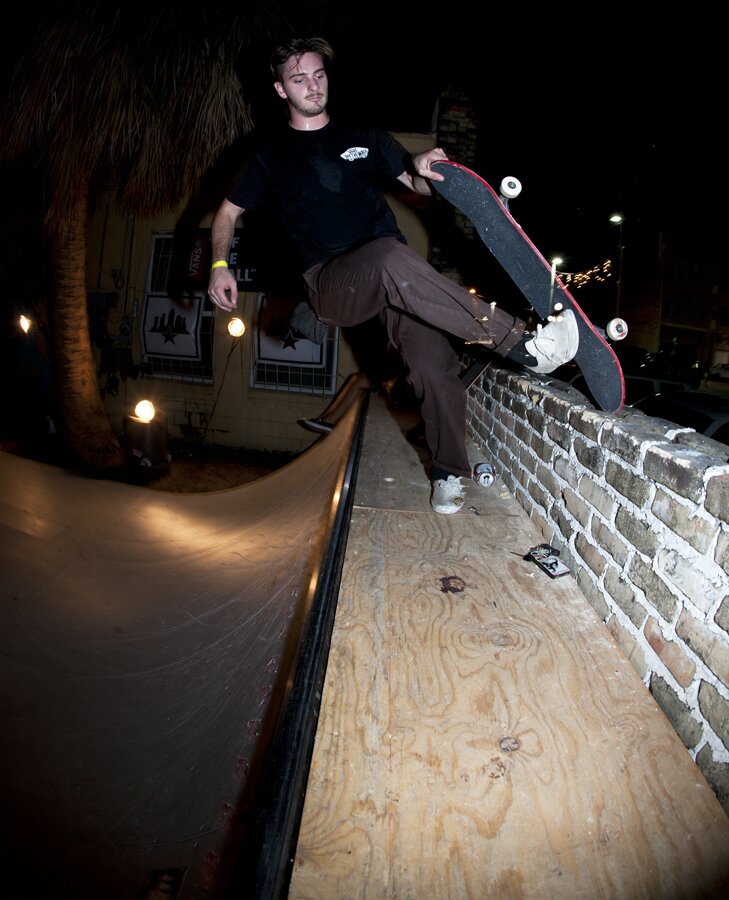 When Gwan Massive exited the stage, I walked back over to the mini-ramp expecting it to be shrouded in darkness, but found SPoT shop employee Michael Andruzzi going full-force with the help of a couple floodlights. Here's Mr. Andruzzi balancing a beanplant.