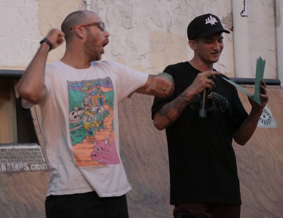 Andrew and Casey announcing the mini ramp and photo contest results.
