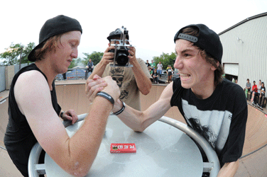 After the Bowl Jam, Timmy Knuth and Paul Hart were the last two trying their tricks so Schaefer had them battle it out in an arm wrasslin' match.