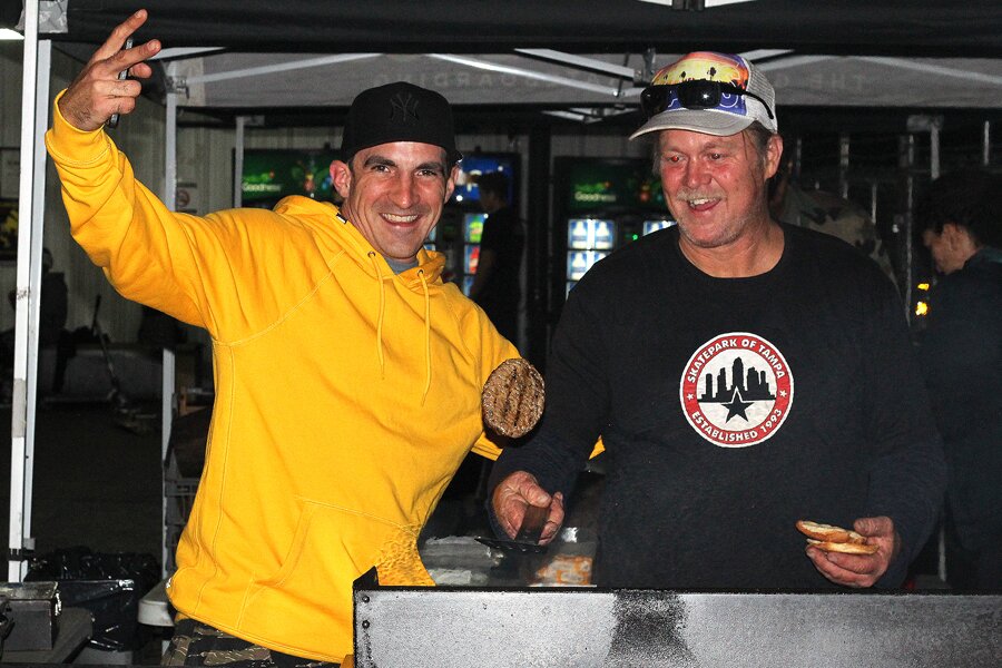 Pete flipping burgers with Alec.
