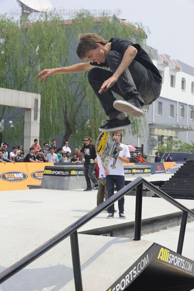 Woodward Beijing Grand Opening Jaws is like a Chinese serpent with that tongue flapping. This is a kickflip over the rail.
