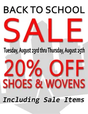 Tuesday (starting at 12:01 am on the webiste) through Thursday, we're having a Back to School Sale. All shoes are 20% off. Shoes that were already on sale are an additional 30% off. You might want to try shopping for shoes by price since there's some damn good deals out there now. We've also got all wovens/ knit shirts on sale at 20% off. Gear up!